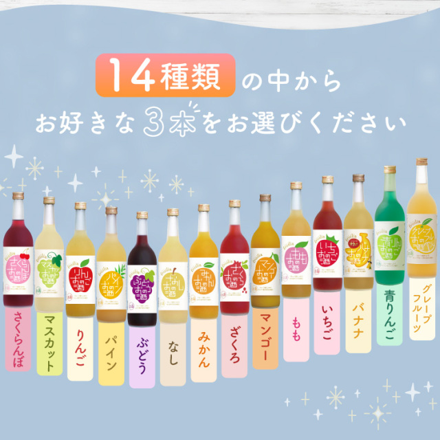 ギフトやハレの日お祝い、自分用にも。贅沢に果実を使用した、果実酒12種類からお好きな果実3種類を選ぶ飲み比べセットです。12種類の果実は、果実の種類は全部で12種類。みかん、りんご、ぶどう、もも、なし、ざくろ、マスカット、マンゴー、パイン、いちご、和柑橘、さくらんぼです。専用のギフト箱にお入れして発送します。果汁をたっぷり贅沢に使用したシリーズです。まるで、果実を食べているいうような、フルーツの香り高い、みずみずしい濃厚な味わいをお楽しみいただけます。アルコール度数は7%で、女性やお酒が弱い方にもおすすめです。冷蔵庫で冷やしてストレートやオンザロック、ソーダ割りがおすすめの飲み方です。