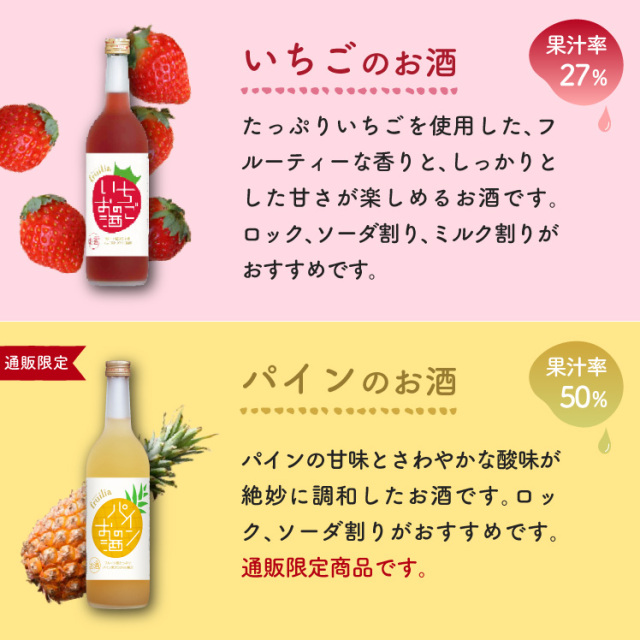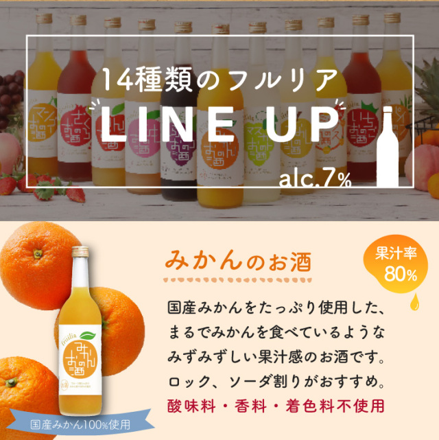| 果実のお酒シリーズは、贅沢に果実を使用し、まるで果実を食べているような味わいをコンセプトに設計しています。お酒が弱い方でも美味しく飲めるように果汁感たっぷり。アルコールは7%ですが、果汁感からあまり感じられないと思います。飲み比べセットですので、是非お好みのフルーツを探してみてください。 |